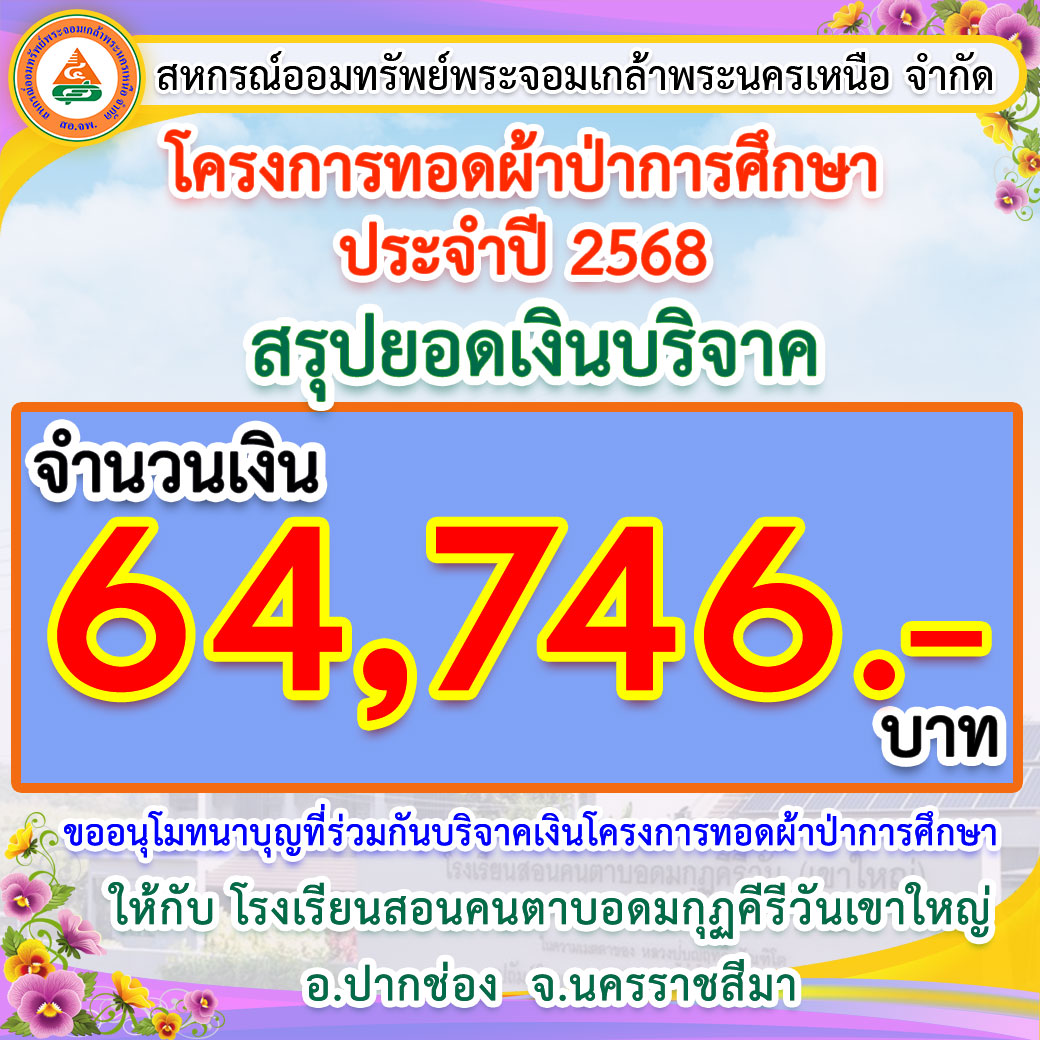 รวมเป็นเงินบริจาคทั้งสิ้น 64,746.00 บาท สหกรณ์ออมทรัพย์พระจอมเกล้าพระนครเหนือ จำกัด ขออนุโมทนาบุญสมาชิกทุกท่านในการร่วมบริจาค ประจำปี 2568 ขอบคุณค่ะ
